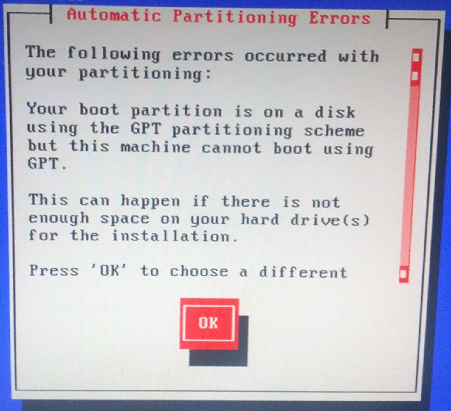 Your boot partition is on a disk using the GPT partitioning scheme but this machine cannot boot using GPT